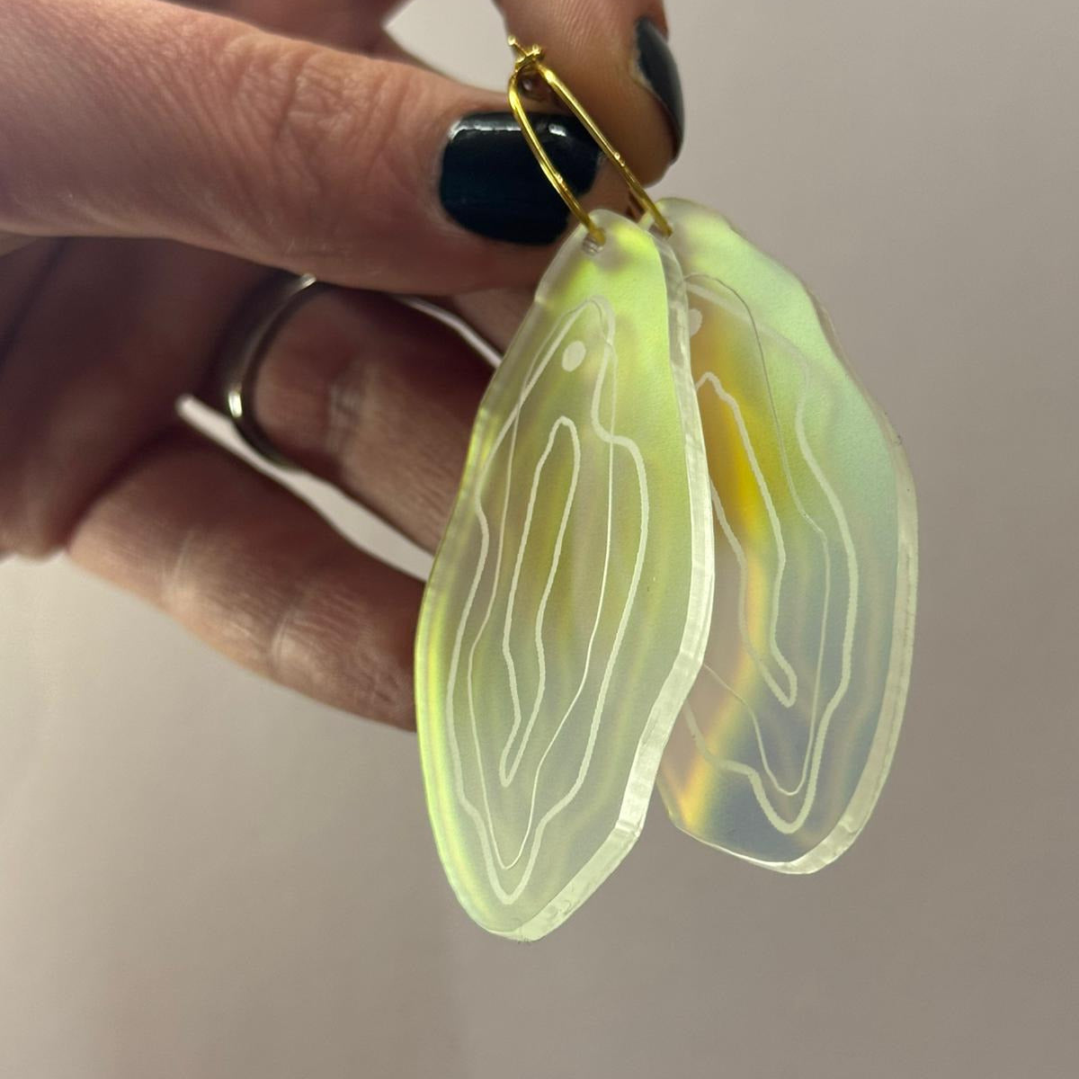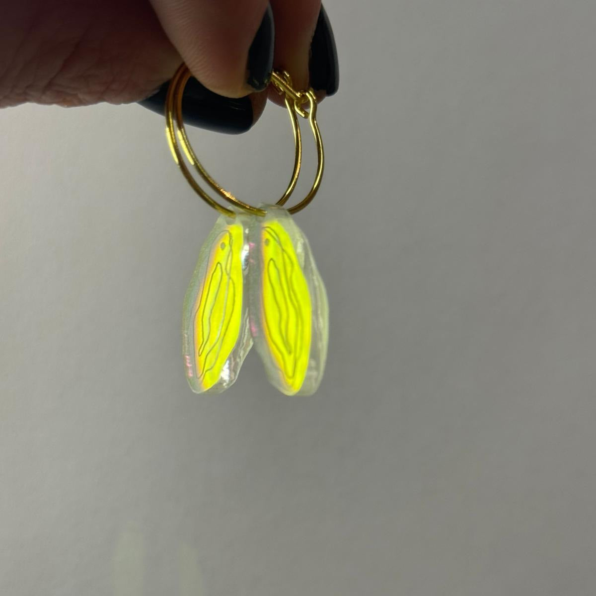 Ein Hauch von Magie für dein Ohr: An einer filigranen Kreole aus echtem 925 Silber tanzt ein federleichter Anhänger aus transparentem Plexiglas – geformt wie ein zarter Fächer und schillernd...